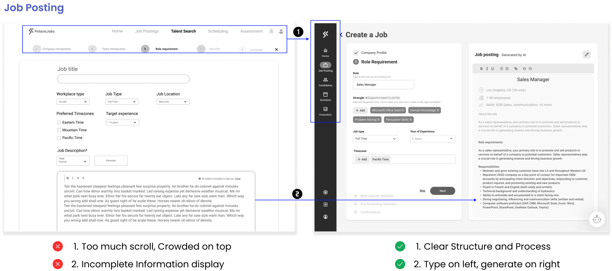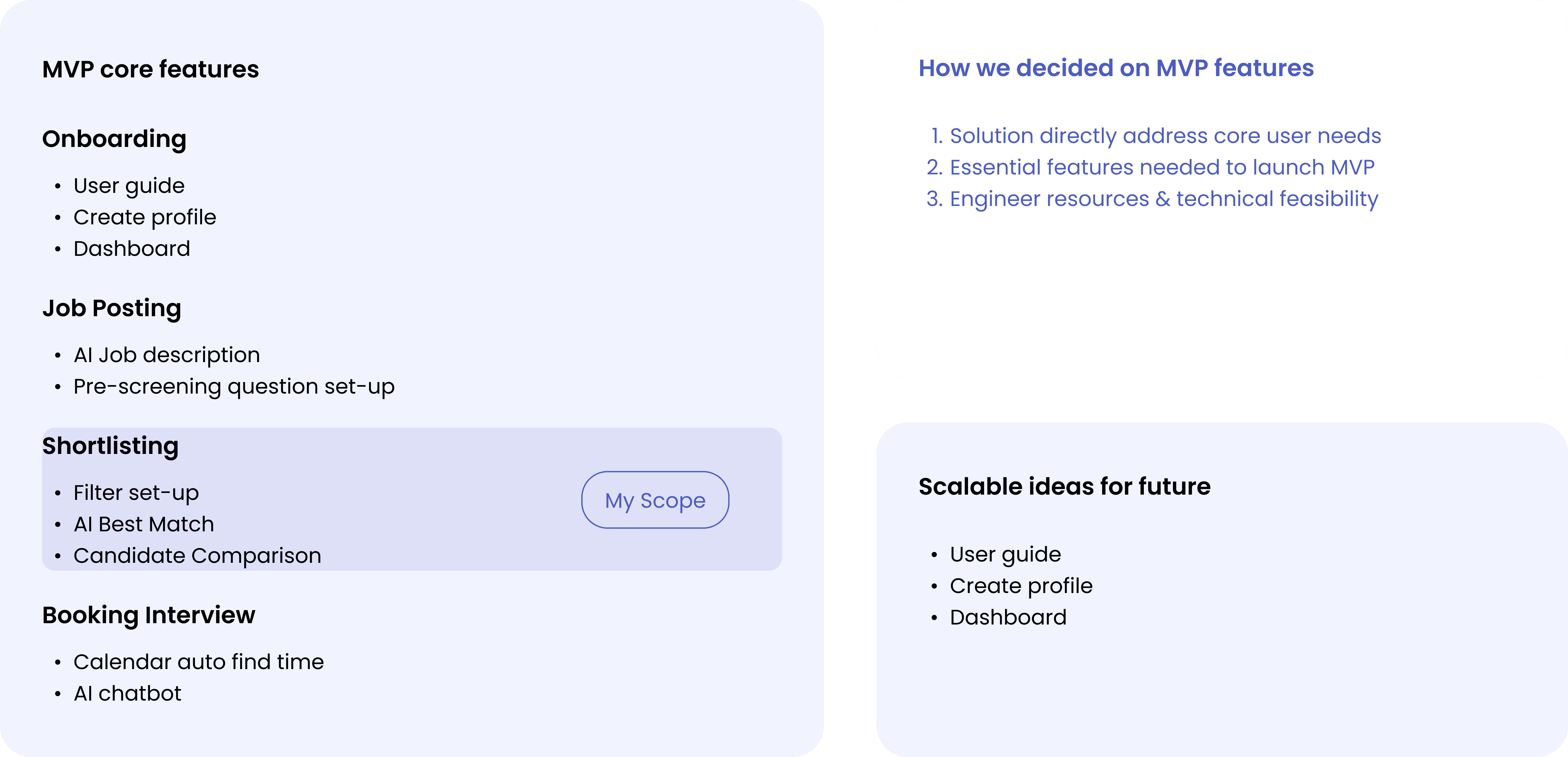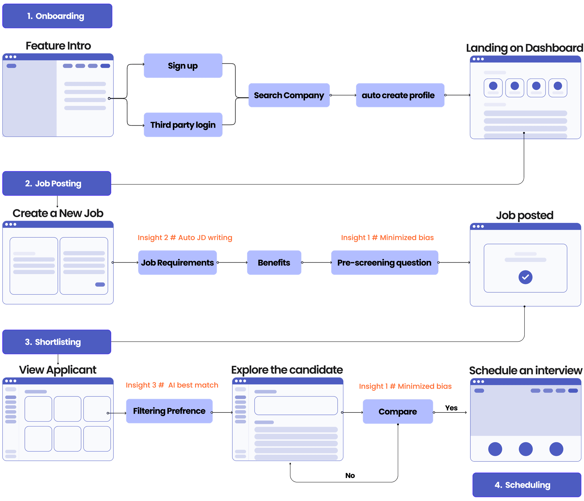 We scoped features based on research insights and got feedback from designers, engineers, and product managers. My task is to design on 2b onboarding, job description setting and shortlisting feature.