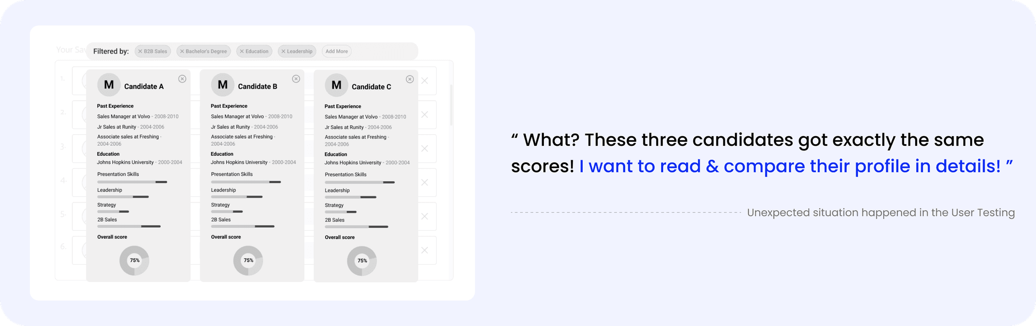 To manage unexpected or exceptional situations, I designed this contingency plan for better manually shortlisting and in detail profile comparison, ensuring a seamless user experience even when AI scores don't go as planned.