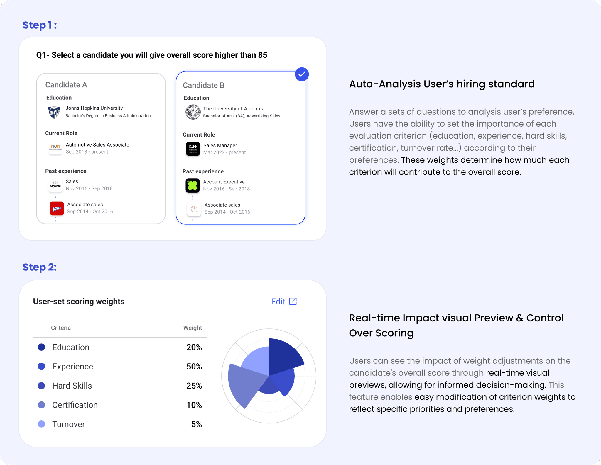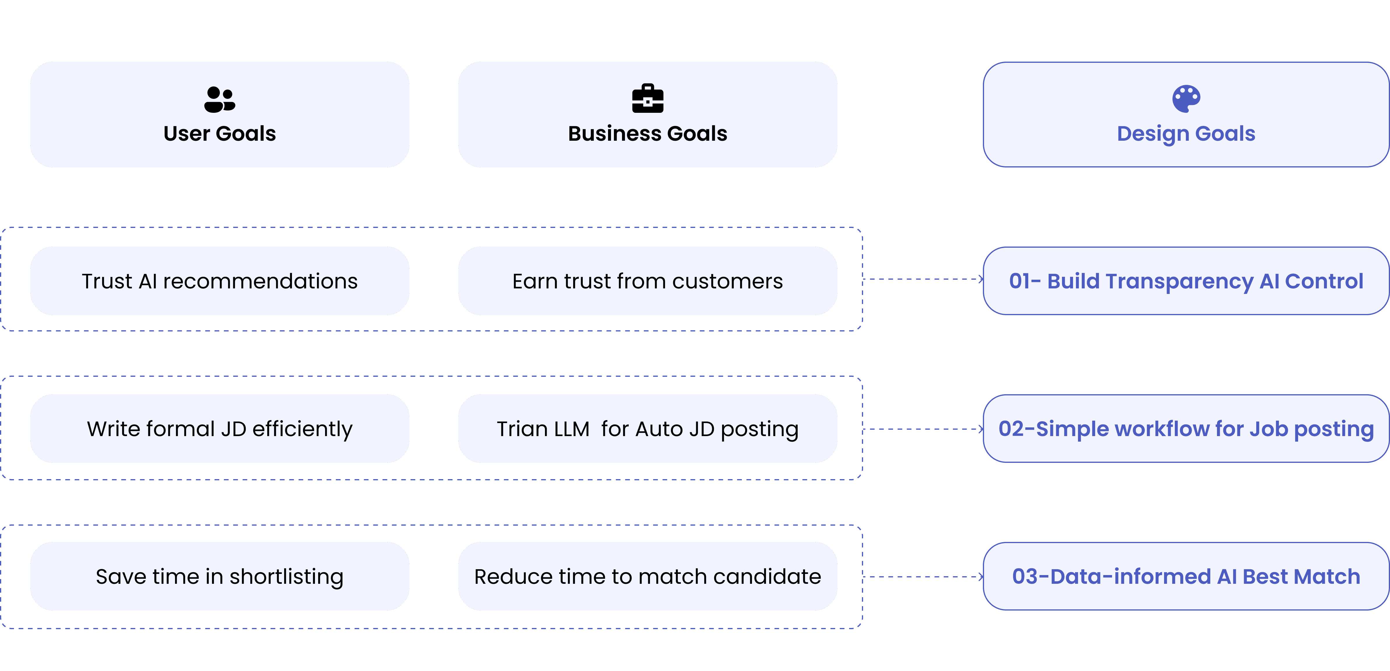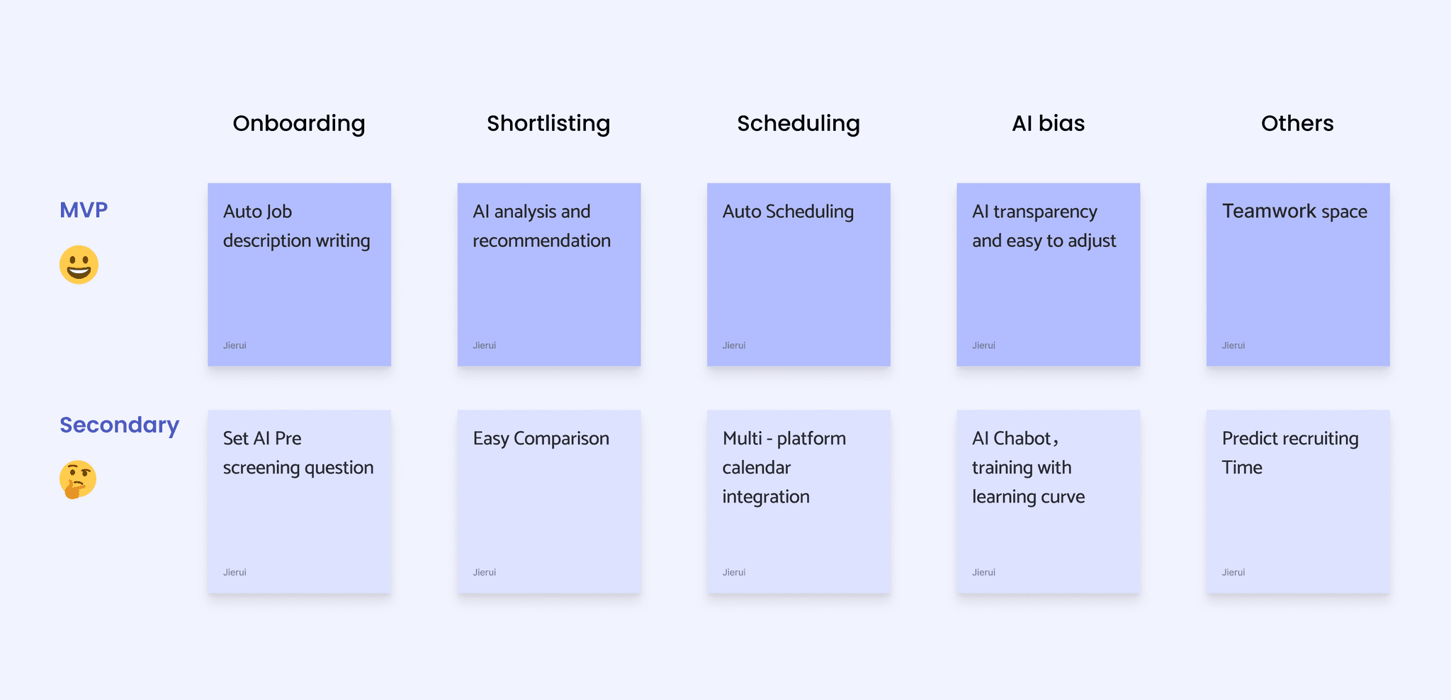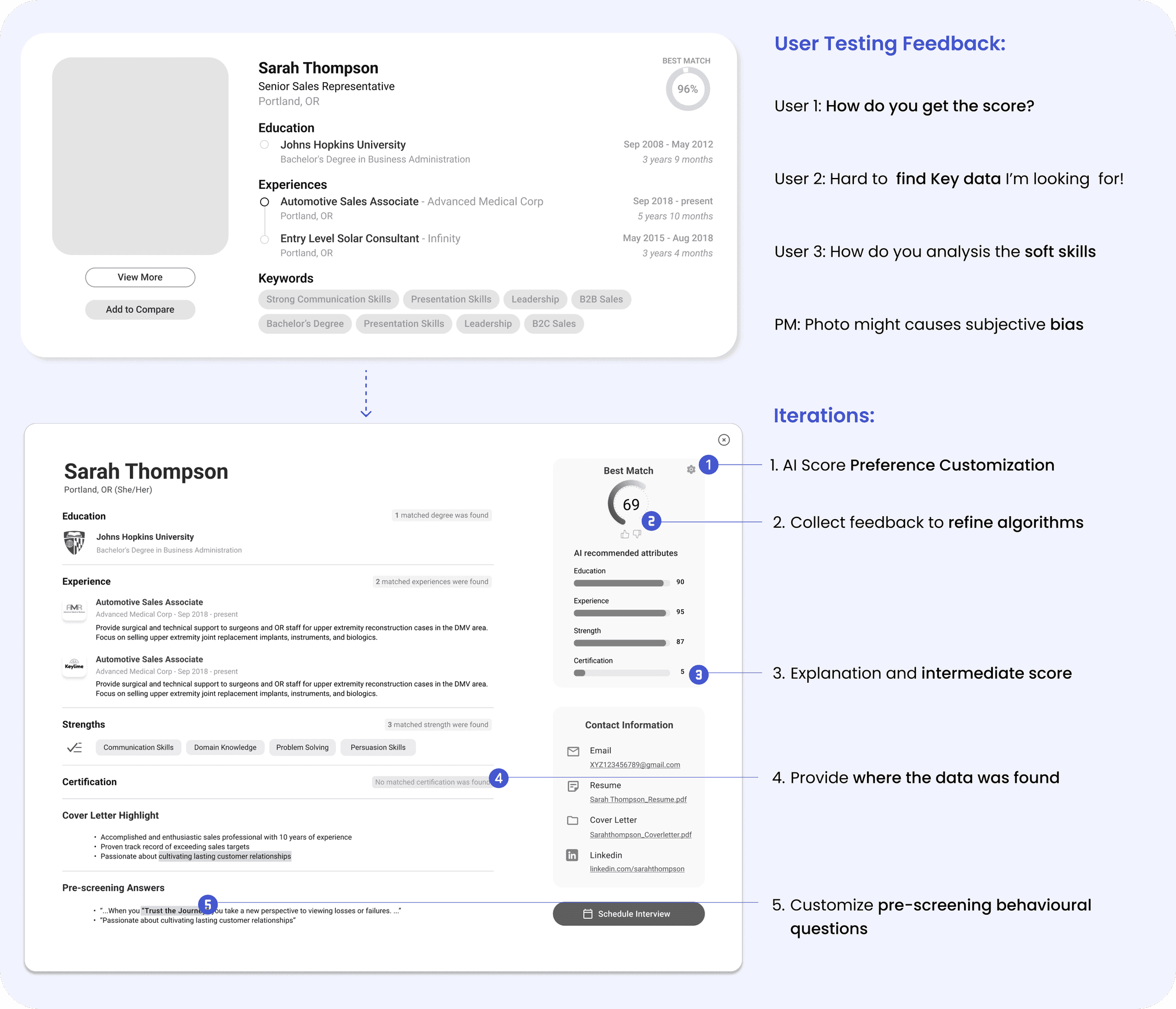 In our interviews, we discovered that many users hold reservations about AI in recruitment, viewing it as unethical to solely rely on AI scoring that may introduce bias. Therefore, the design team will prioritize building trust in AI while allowing sufficient manual oversight and adjustment capabilities.