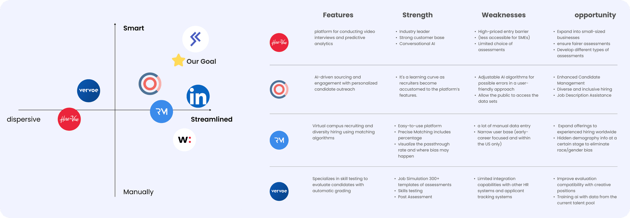 Existing AI recruitment platforms are content-heavy, lack streamlining due to a high learning curve.
