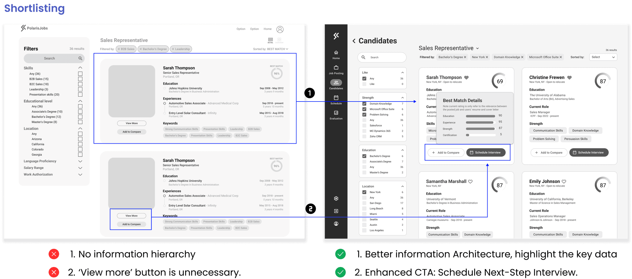 After testing the initial user flow with developers, I moved 'adjust hiring preference' before the shortlisting, and added pre-set question to establish hiring preference, it conserves 20% of AI computational power by reducing redundant calculations and searches, as the AI only needs to process candidate data once, based on the user-defined weights and preferences set beforehand.